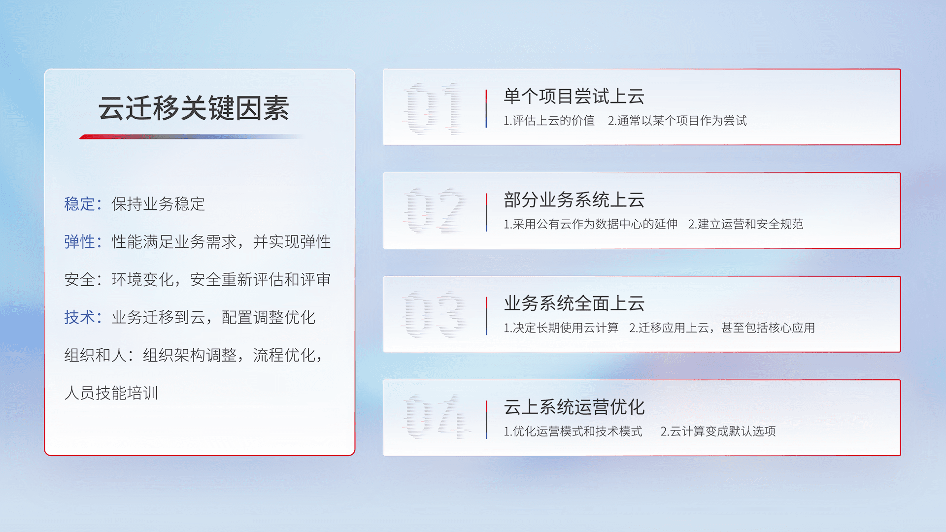 结合实际业务,,,,从规划设计、、、、云平台选型、、、、云原生改造、、、、数据迁移、、、集成交付,,迁移全过程为客户识别最佳上云路径,,,,做好风险识别管理,,设计网络架构、、身份权限、、、、安全审计合规、、操作审计、、、日志审计、、监控告警策略、、、、多站点容灾设计等,,对云上基础设施进行整体规划,,提升IT治理水平,,以满足弹性、、高可用、、高性能的需求。。。。
