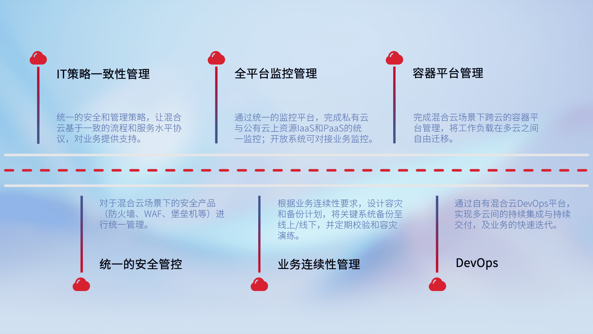 通过多云纳管,,以统一的资源数据模型把客户的云资源进行抽象和封装,,,进而实现对多云资源的统一操作,,,,保障云资源管理的可靠性、、稳定性与可用性。。。量身定制化运维内容,,配置、、开发运维、、补丁管理、、、、备份、、监控、、、认证和访问管理、、、审计和日常巡检等,,保障在用云过程中的可靠度,,,,稳定度以及高可用率。。。。