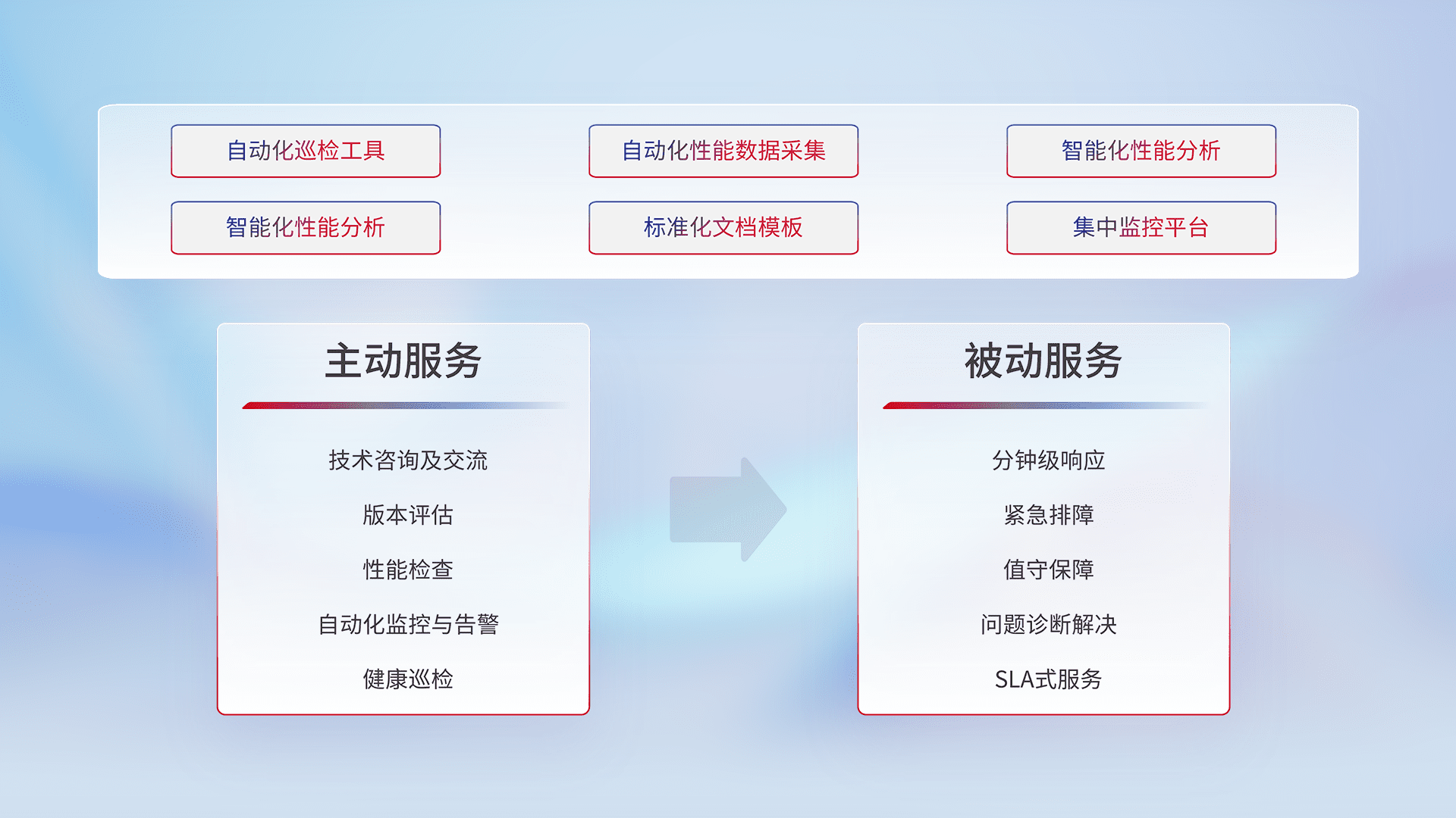 智能化工具和标准化文档,,保障服务质量,,,提供主动服务(包含技术咨询、、版本评估、、、、性能检查、、、自动化监控与告警、、、、健康巡检)和被动服务包含(分钟级响应、、紧急排障、、值守保障、、、、问题诊断解决、、SLA服务)。。