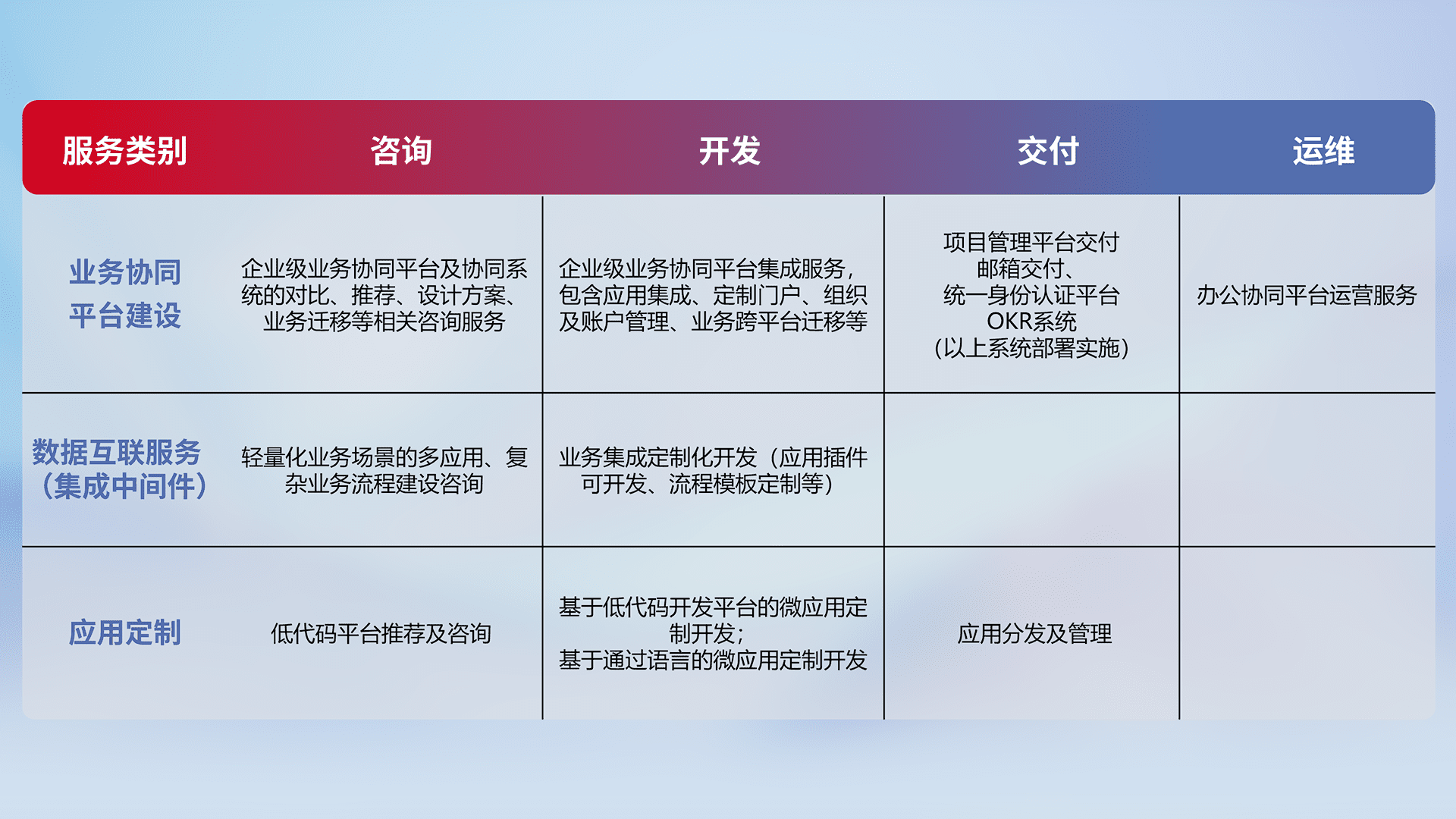 针对钉钉、、、、企微、、、IDaas等平台级产品提供产品的规划、、、方案、、、交付、、、定制化开发等服务,,,实现如统一协同办公、、、、智能客户服务、、、、混合会议管理、、、、智能数据查询、、、、等业务场景,,,实现数字化转型。。。